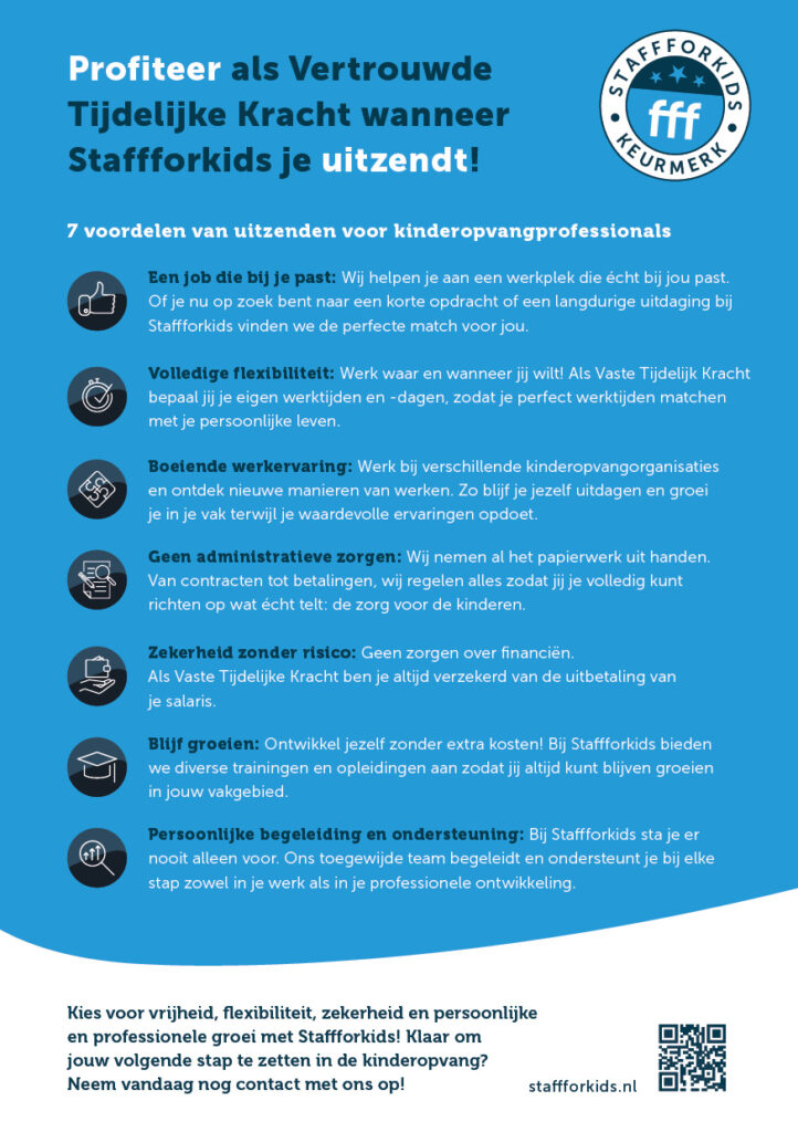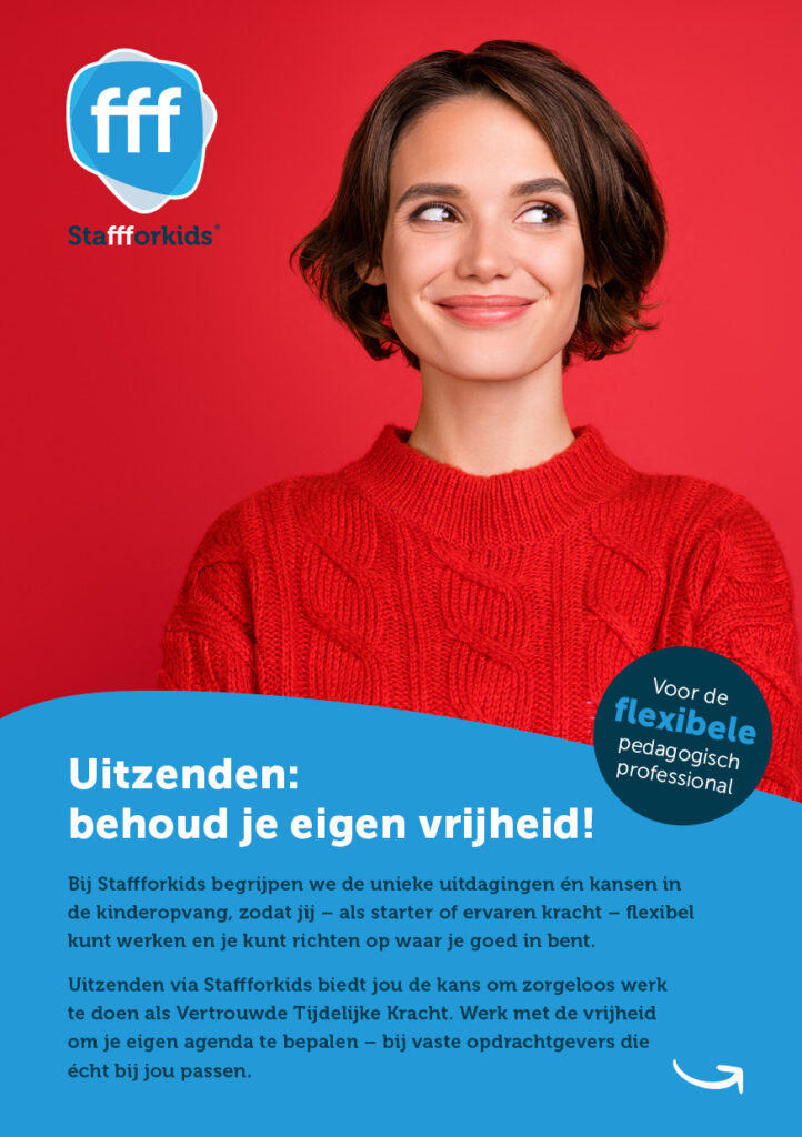 Staffforkids is ook een in kinderopvang gespecialiseerd uitzendbureau. Wij zenden kinderopvangprofessionals zoals pedagogisch professional, interim managers uit naar kinderopvangorganisaties die tijdelijk iemand nodig hebben. Het is niet goed voor kinderen als ze telkens met andere tijdelijke krachten worden geconfronteerd. Daarom zenden wij nooit pedagogisch professional voor slechts 1 dienst uit naar een kinderopvangorganisatie. Nee, wij werken uitsluitend op basis van opdrachten voor herhalende inzet gedurende langere periodes en zoeken zorgvuldig de bijpassende pedagogisch medewerkers uit. Hierdoor wordt je als Staffforkids-uitzendkracht voor de kinderen al snel een echte VTK: Vertrouwde Tijdelijke Kracht.