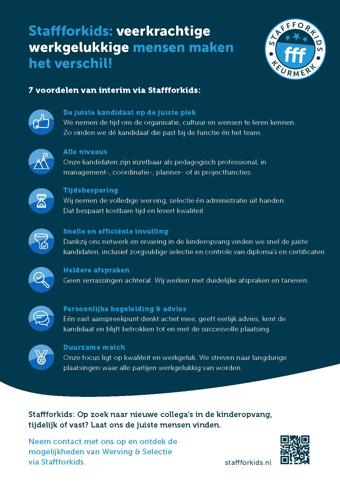 Met Staffforkids bespaar je tijd en moeite. Wij verzorgen het volledige traject: vacatureteksten, actieve werving, voorselectie en kennismaking. Jij hoeft alleen nog ja te zeggen tegen de kandidaat die perfect past. Zo bouw je aan een team dat vol energie en enthousiasme klaarstaat.